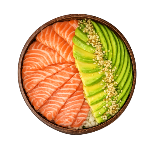 Tranches de Sashimis sur base de riz vinaigré. Avocat, Saumon